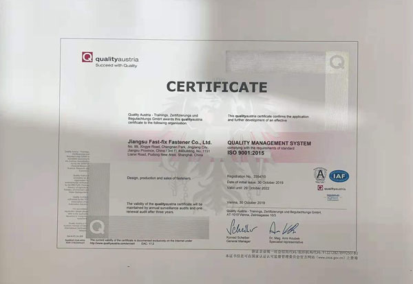 飛可斯鉚釘通過ISO9001:2015認(rèn)證