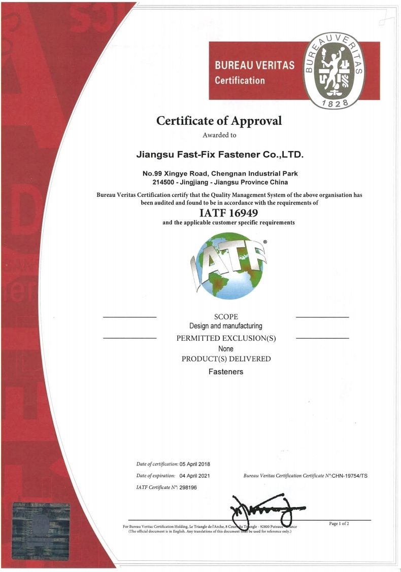 FASTFIX has been ISO/TS16949 certified since 2009, by Bureau Veritas. It is now renewed to be IATF16949:2016. FASTFIX RIVET is making always effort to provide improved quality products to automotive customers worldwide. IATF16949 emphasizes developing a process oriented quality management system that provides for continual improvement, defect prevention and reduction of variation.